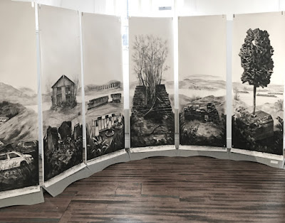 Without a car, and deliberately minimising use of a mobile phone, most of my time was spent outdoors - walking the 30k Dyffryn Maentwrog / Llyn Mair footpath network surrounding the studio and indoors - trying to find some kind of visual equivalent to my experiences of nature, industrial heritage and, most of all, weather.